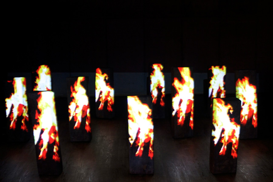 • is part of series about the four main elements in the universe fire, water, air and soil.Destruction of civilization was the main insight where the wooden pieces served sometimes as gravestone and another as high buildings rising up and falling down. Also there is feeling of mixing different culture through various symbolic geometric shapes, where fire eats all and gives birth to new era where mankind could rise again with a new beginning.